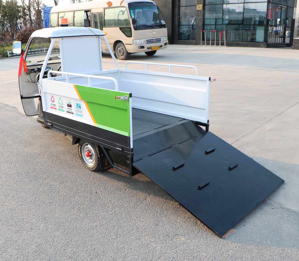 3、適用于短途駁運垃圾桶,可裝載4個240L標準垃圾桶;裝卸方便,集垃圾收集、存儲、清運于一體,有效提高作業效率;